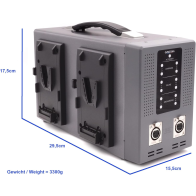 Professional charger PATONA 1709 v-Mount 3A 4-channel, with durable metal body and 4-pin XLR cable (DC). Designed to simultaneously charge up to 4 V-Mount batteries, providing an efficient and reliable solution for film sets and professional video productions.