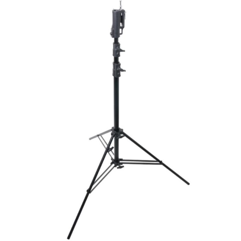 The Kupo Master Combo HD Stand (Black) is a black powder coated steel combo stand with a load capacity of 88.2 lbs (40 kg). Combo stands get their name because of their unique head design. It features the triple function universal combo head withboth 1/8" (28mm) and 5/8" (16mm) receivers plus a multi-direction 5/8" (16mm) stud giving you great versatility when it comes to mounting options. Also features a leveling leg that enables the user to extend one leg more than the others to level out the stand on an incline or uneven terrain. Each riser is spring cushioned as a safety feature to protect lighting fixtures from a sudden drop if the locking collar becomes loose.The solid aluminum casting knob, paired with a stainless bolt, ensures reliable and long-lasting operation. The die-cast riser features a stainless steel heli-coil insert, providing a durable threaded hole. The upper spider casting includes a hanger for convenient storage on the rack. It also features an ear ring device for a wind-bracing kit. The stand leg is equipped with a PA66 foot pad, protecting both the leg and the ground. Additionally, it has a sizable brake shoe for a secure lock-off mechanism.