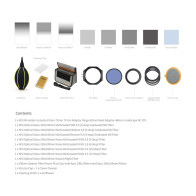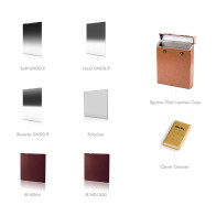 Kit con 1 filtro GND Soft 150 x 170mm, 2 filtri ND 150 x 150mm, 1 polarizzatore circolare 150x150mm, custodia e accessori.
