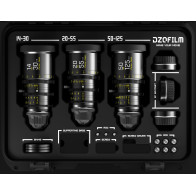 Kit di obiettivi zoom Pictor14-30mm, 20-55 mm e 50-125 mm T2.8 Super35 di DZOFilm comprende un set di tre lenti nere. Ogni obiettivo viene fornito di serie con un innesto PL e include anche un innesto EF Canon per la compatibilità con un'ampia gamma di fotocamere digitali per il cinema.