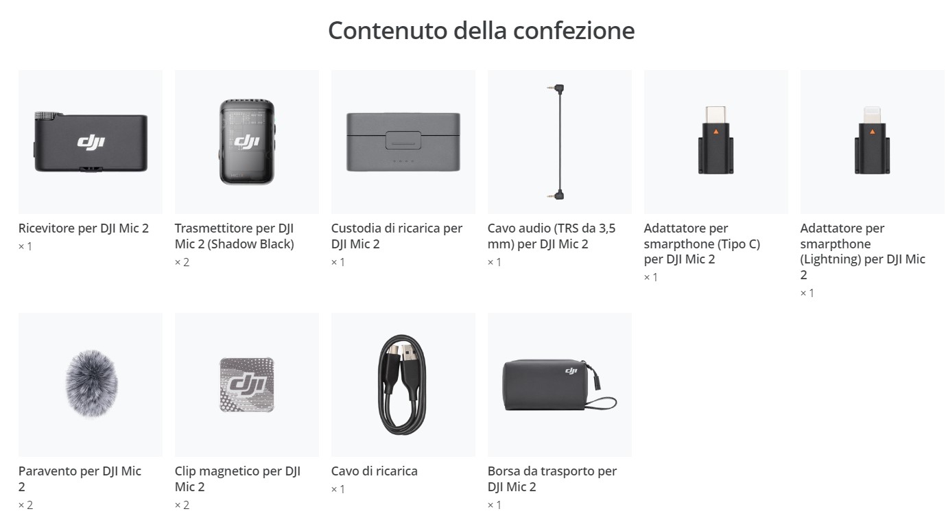 Eliminazione intelligente del rumore; connessione Bluetooth diretta con TX Osmo Action 4 - Osmo Pocket 3 - Cellulare; 6 ore di durata della batteria con una sola carica; 18 ore di autonomia massima con custodia di ricarica, registrazione interna di 14 ore in float a 32 bit.